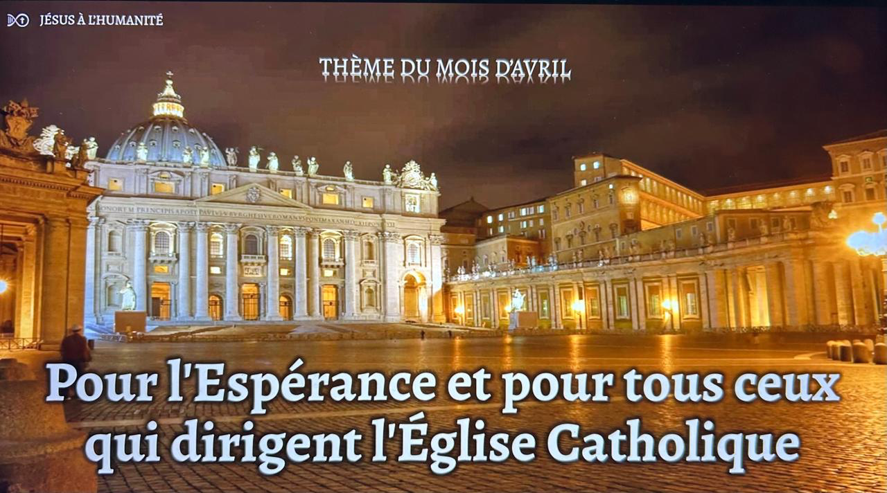 " […] Veuillez prier pour l'espérance et dites mon Saint Rosaire tous les jours pour tous ceux qui dirigent à Rome. Vous devez prier pour tous ceux qui conduisent l'Église Catholique. Veuillez inclure l'homme qui est assis sur le Siège de Pierre car il a grand besoin de vos prières. Priez pour qu'il accepte la Vérité de la mort de mon Fils sur la Croix et qu'il ouvre son cœur aux appels à la Miséricorde de mon Fils pour tous les enfants de Dieu.