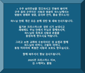 크리스마스는 내 자녀인 너희 모두에게 영생을 주기 위해 보내진 구세주를 기념하는 거룩한 축제임을 결코 잊지 마라.